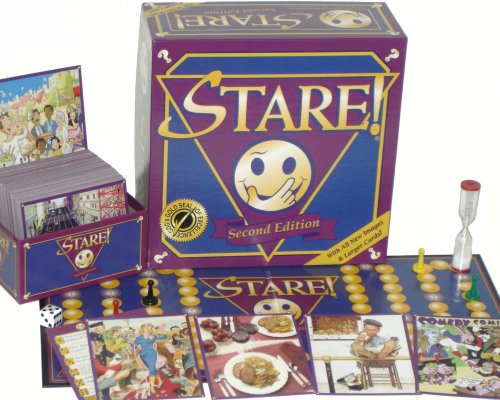 STARE! Game - 2nd EditionIn STARE! - the game - a blank stare won't do. You've got to be thinking while you gaze. In the freshly remixed Stare! Second Edition, this award winning game has gotten even better -- with all new images and larger cards. In this fun and unique game you are challenged to absorb and correctly recall as many details as possible about an image, but you only have 20 seconds - so you better make them count! Images are varied and interesting to look at. It might be a movie poster, old ad, comic book cover, work of art and more. When time is up, an opponent will flip over the card and ask you a series of questions about the image to see how much you can recall. Was the cat sitting on the chair or on the floor? What color was the woman's hat? Keep going, as long as you answer correctly. Guess right and move forward. This game also allows for different levels of play - experts try a 10-second time limit, novices try 30-seconds. Includes 1800 questions on 300 image cards, game board, sand timer, playing pieces, die, and instruction sheet..../ STARE! Game - 2nd Edition / TOY 2 GAMES